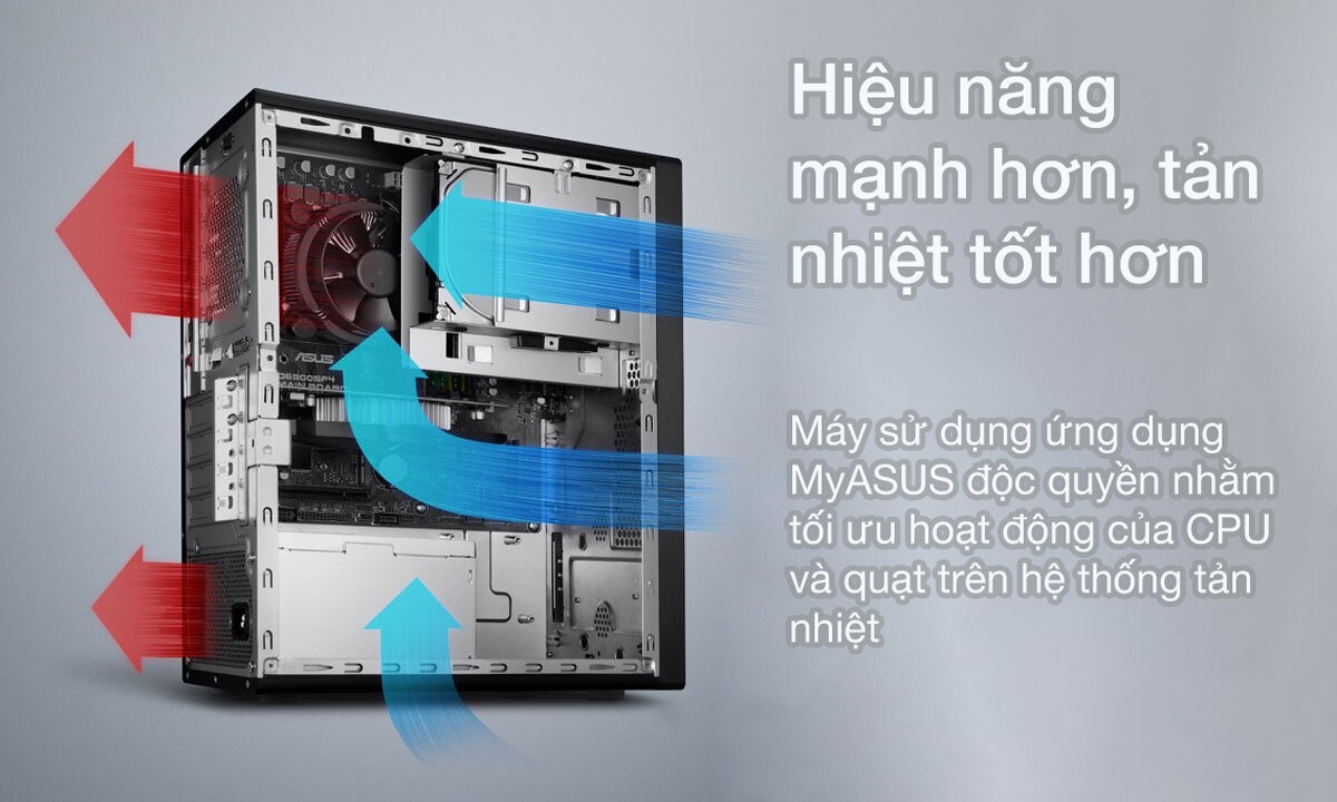Asus D500ME được trang bị hệ thống tản nhiệt tiên tiến, giúp máy hoạt động ổn định và bền bỉ. Hệ thống này bao gồm quạt làm mát nâng cao, được thiết kế để tối ưu hóa luồng không khí và giảm thiểu tiếng ồn. Quạt làm mát có khả năng điều chỉnh tự động theo nhiệt độ của máy, đảm bảo hiệu suất làm mát tối ưu trong mọi điều kiện sử dụng. Điều này giúp máy duy trì hiệu suất cao mà không bị quá nhiệt, đồng thời kéo dài tuổi thọ của các linh kiện bên trong.