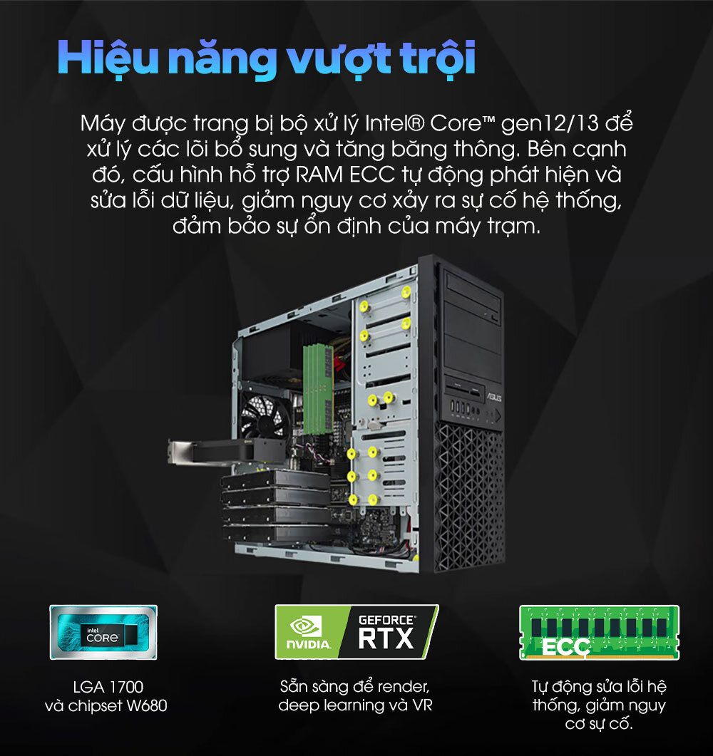 ASUS E500G9 được thiết kế dành cho các chuyên gia sáng tạo cần hiệu suất mạnh mẽ, độ tin cậy và bảo mật nâng cao. Phần cứng chuyên dụng (RAM ECC, các dòng VGA chuyên nghiệp...) hỗ trợ tự động sửa lỗi tác vụ, hệ thống giúp hệ thống luôn ổn định trong suốt quá trình làm việc.