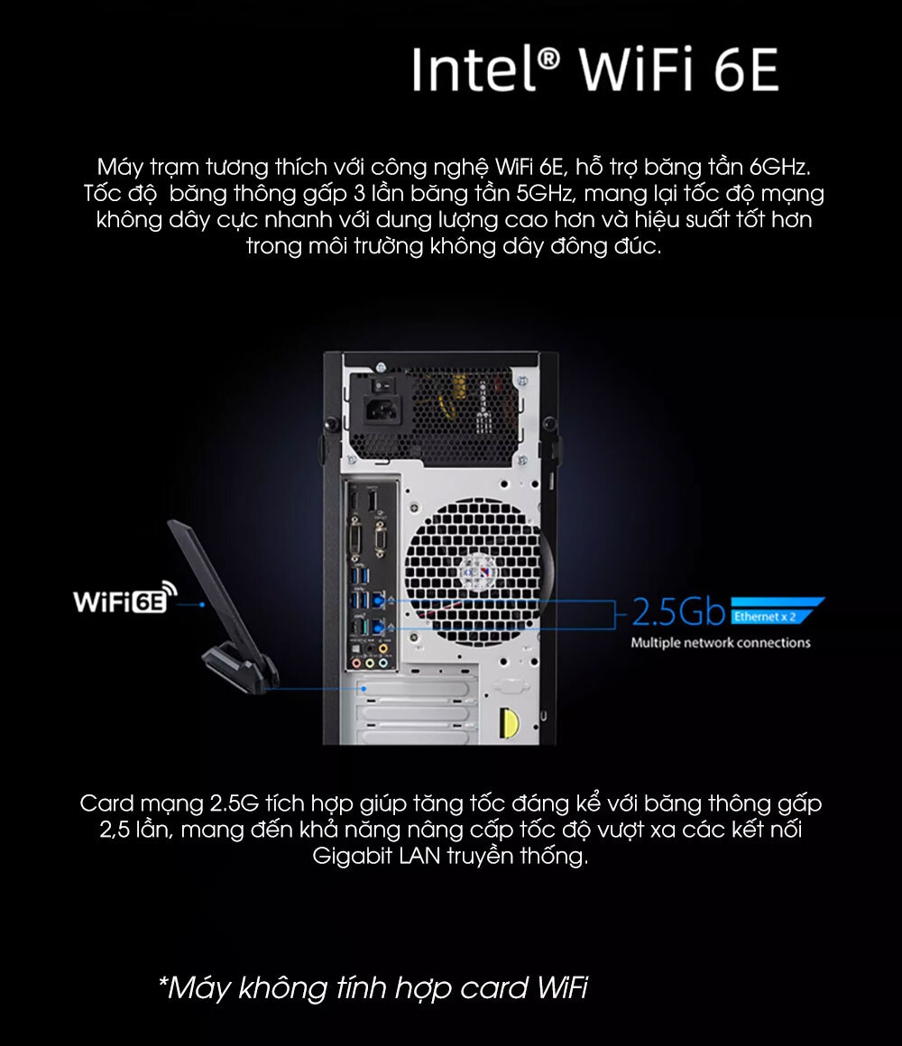 Ethernet tích hợp 2.5G sẽ nâng kết nối Ethernet của bạn lên một tầm cao mới với khả năng cải thiện băng thông lên tới 2,5 lần để nâng cấp tốc độ đáng kể so với các kết nối Gigabit LAN truyền thống. Bằng cách sử dụng cáp Ethernet hiện có, bạn có thể tận dụng nâng cấp mạng này để trải nghiệm truy cập internet mượt mà hơn, không bị lag, phát trực tiếp video có độ phân giải cao và tận hưởng tốc độ truyền tệp nhanh hơn.