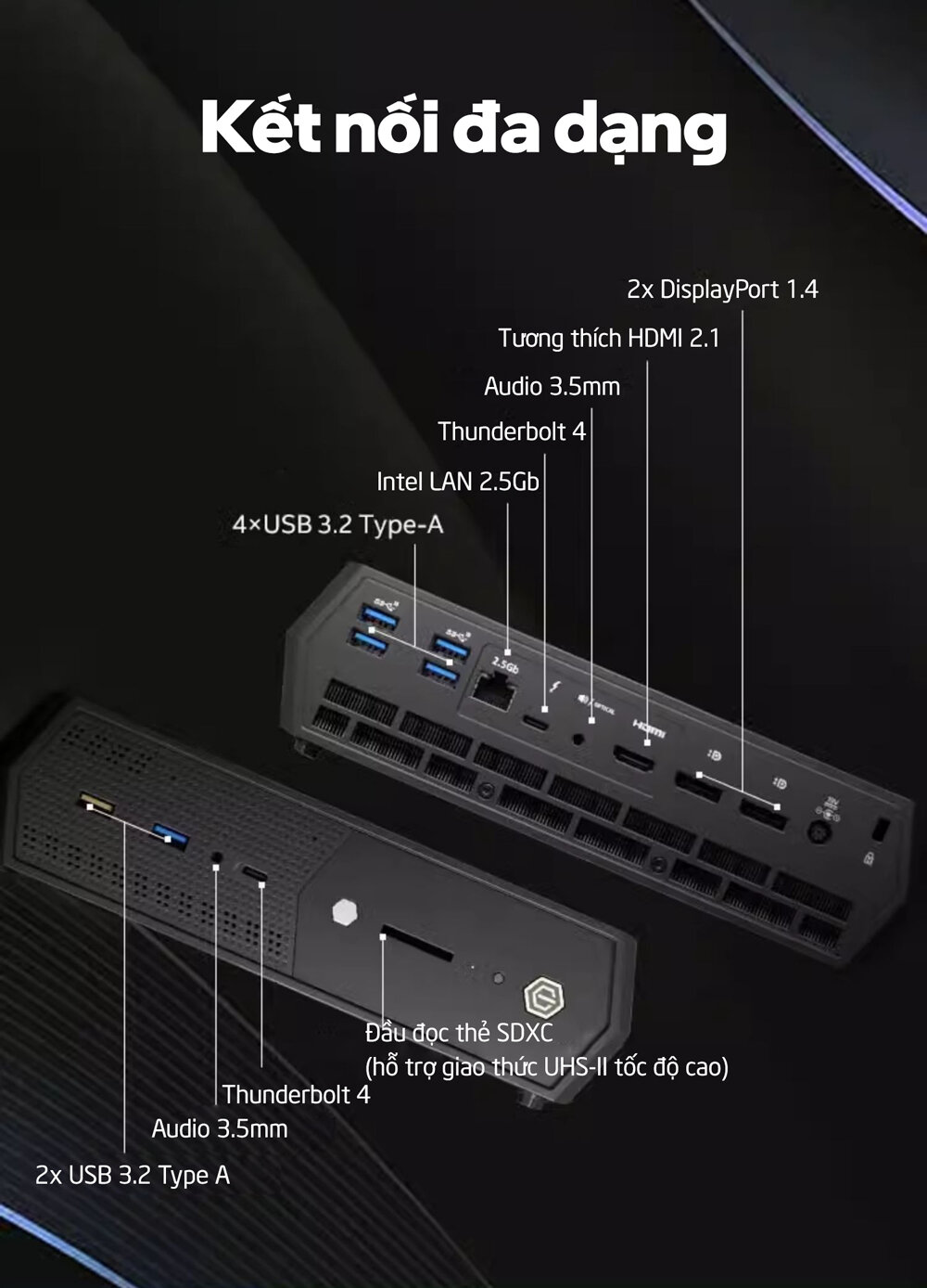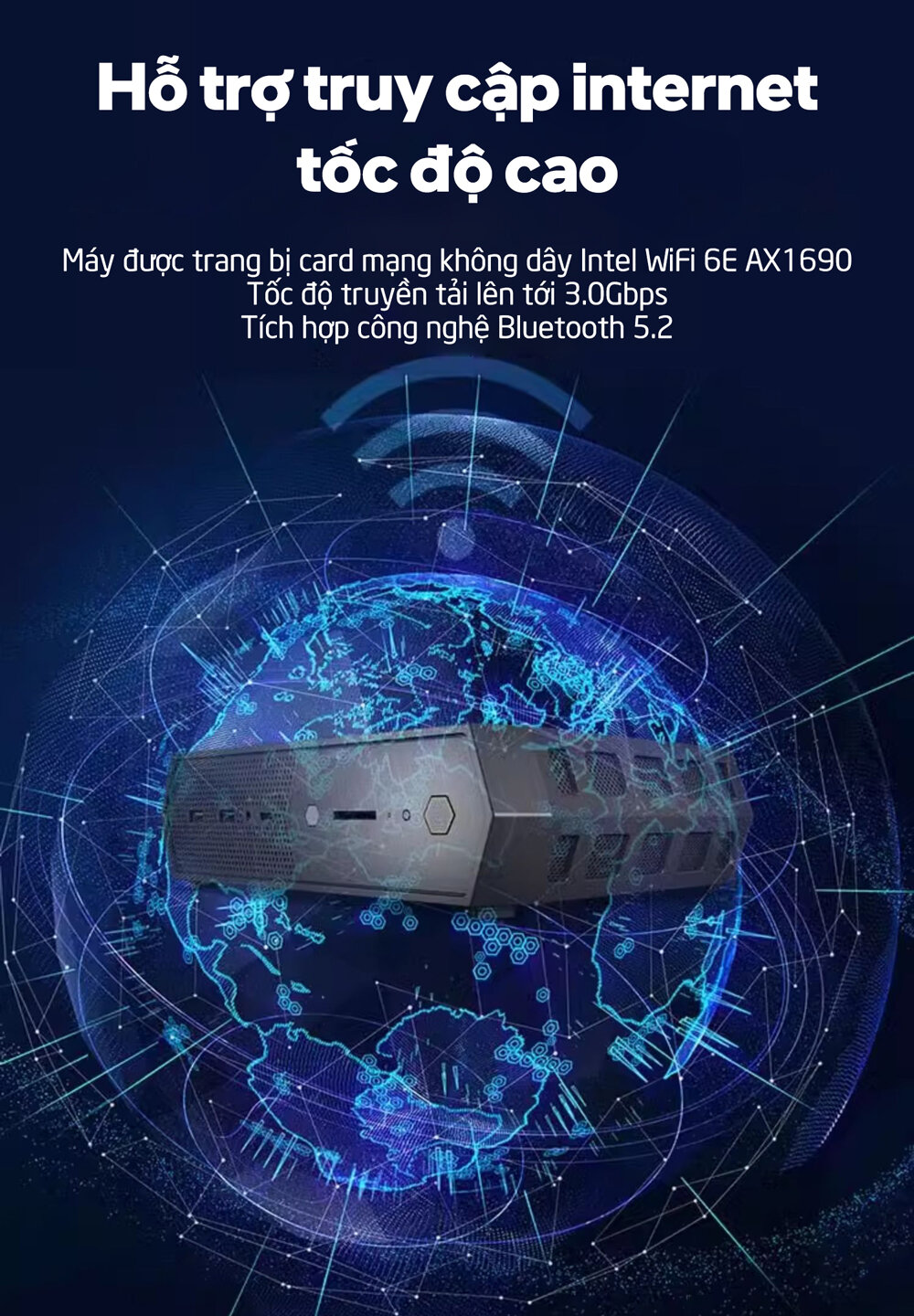 Thêm vào đó, card mạng Intel Killer Wi-Fi 6E AX1690i kết nối không dây với tốc độ cao và khả năng mở rộng linh hoạt. Khả năng di động và tự do của kết nối không dây cho phép bạn kết nối từ bất kỳ đâu mà không bị hạn chế về không gian và vị trí. Điều này rất thuận tiện cho việc sử dụng máy tính mini trong các không gian khác nhau.