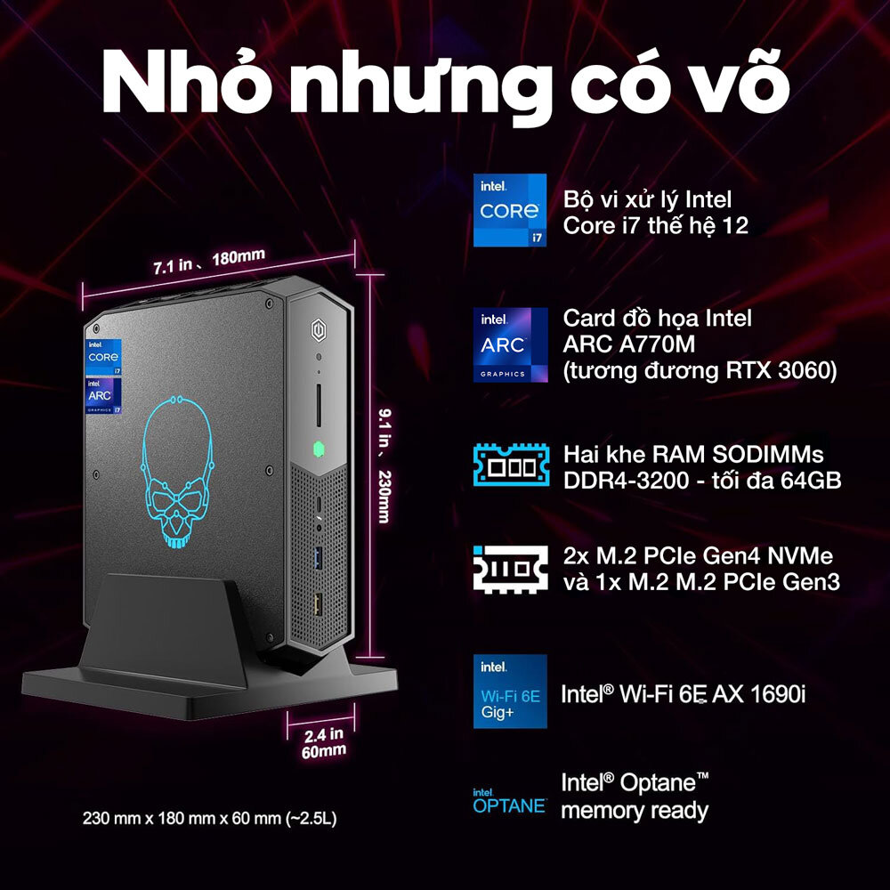 Thông số kĩ thuật Máy tính để bàn Asus NUC 12 Enthusiast Kit RNUC12SNKI72001 - Intel Core i7-12700H, Intel Arc A770M 16GB GDDR6