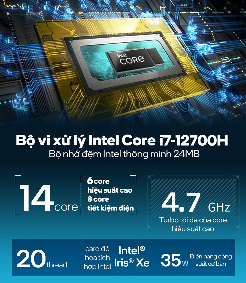 Intel Core i7-12700H là một trong những lựa chọn tối ưu cho các dòng máy laptop, PC Mini hiệu suất cao, đáp ứng tác vụ đa nhiệm xong vẫn có thể tiết kiệm điện. i7-12700H có 6 P-Core và 8 E-Core cho tổng số 20 luồng xử lý, cùng với 24MB bộ nhớ đệm L3 và một GPU 96 EUs.