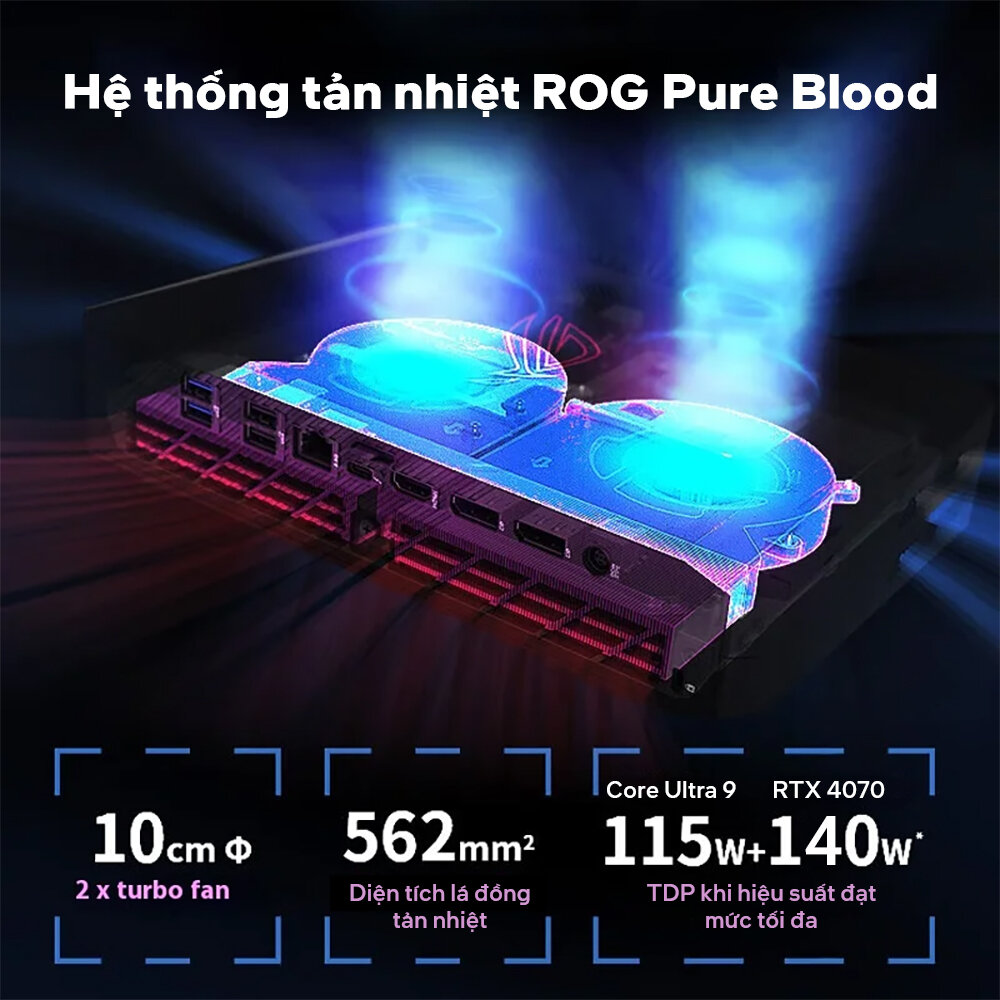 Hệ thống tản nhiệt “Pure Blood” của ASUS ROG NUC là một giải pháp làm mát hiệu quả và thông minh, được thiết kế để đối phó với nhiệt độ cao trong khi vẫn duy trì hiệu suất ổn định. Ống đồng tản nhiệt bao phủ toàn bộ các thành phần tỏa nhiệt chính như CPU, GPU, VRM và VRAM, giúp tăng sự ổn định của hệ thống. Các cánh quạt mới được làm từ nhựa tinh thể chịu nhiệt, kháng hóa chất và có thể đúc khuôn mỏng hơn, giúp tăng luồng khí mát vào máy và giảm tiếng ồn.