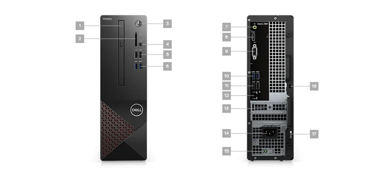 1. Ổ đĩa DVD (Tuỳ chọn) | 2. Đầu đọc thẻ | 3. Nút nguồn | 4. Jack âm thanh | 5. (2) Cổng USB 2.0 | 6. (2) Cổng USB 3.2 Gen 1 Type-A | 7. Jack âm thanh | 8.Cổng HDMI | 9. Cổng VGA | 10. (2) Cổng USB 3.2 Gen 1 Type-A | 11. (2) Cổng USB 2.0 | 12. Cổng RJ-45 Ethernet | 13. Khe cắm mở rộng | 14. Nguồn | 15. Đèn báo nguồn | 16. Khe mở rộng chờ | 17. Lẫy khoá Kích cỡ & cân nặng