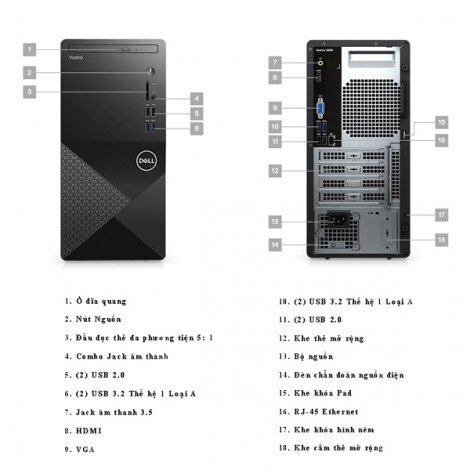 Kết nối 1. Ổ đĩa quang | 2. Nút Nguồn | 3. Đầu đọc thẻ đa phương tiện 5: 1 | 4. Combo Jack âm thanh | 5. (2) USB 2.0 | 6. (2) USB 3.2 Thế hệ 1 Loại A | 7. Đường ra | 8. HDMI | 9. VGA | 10. (2) USB 3.2 Thế hệ 1 Loại A | 11. (2) USB 2.0 | 12. Khe thẻ mở rộng | 13. Bộ nguồn | 14. Đèn chẩn đoán nguồn điện | 15. Khe khóa Pad | 16. RJ-45 Ethernet | 17. Khe khóa hình nêm