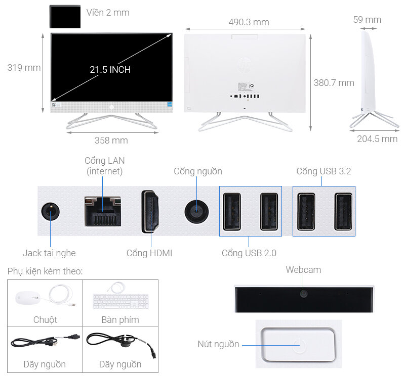 Thông số kĩ thuật Máy tính để bàn HP 22-dd2045d 9A8M7PA - Intel Core i3 1215U, RAM 8GB, SSD 256GB, Intel UHD Graphics, 21.5 inch