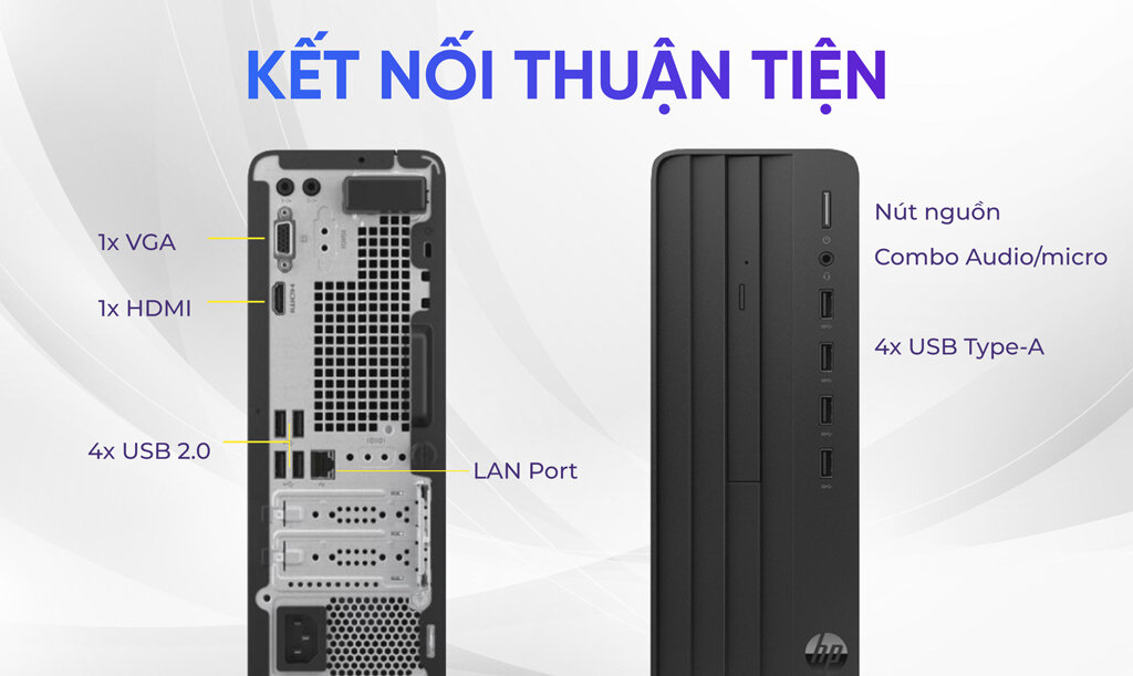 PC HP 280 Pro G9 SFF (9H1S5PT) tich hợp các cổng kết nối tiêu chuẩn thường thấy ở các bộ máy đồng bộ hãng: VGA, HDMI, RJ-45, USB,....Người dùng có thể kết nối với các thiết bị ngoại vị khác.