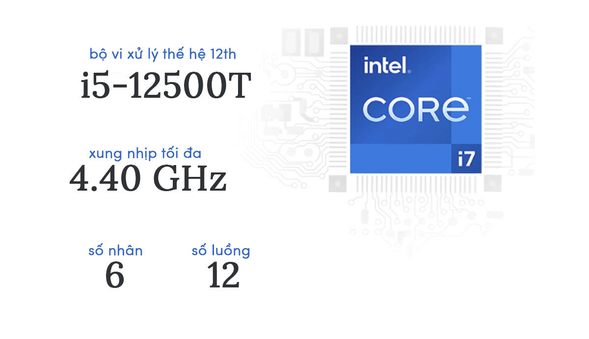 Sự lựa chọn tuyệt vời cho người dùng cần một máy tính đa năng và tiết kiệm không gian,  ra đời với đầu não là vi xử lý core i5-12500T gồm 6 nhân 12 luồng trong đó có cả 6 nhân đều là nhân hiệu suất cao P-core, xung nhịp tối đa ta nhận được trên con chip khủng này là 4.40 GHz tích hợp là VGA onboard Intel UHD Graphics 730 cho bạn xử lý đa tác vụ dễ dàng.
