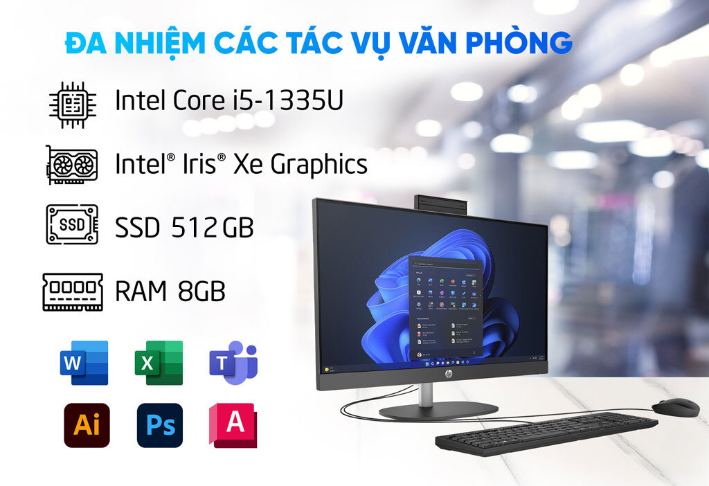 Thông số kĩ thuật Máy tính để bàn HP ProOne 240 G10 AIO 9H0B2PT - Intel Core i5-1335U, RAM 8GB, SSD 512GB, Intel Iris Xe Graphics, 23.8 inch