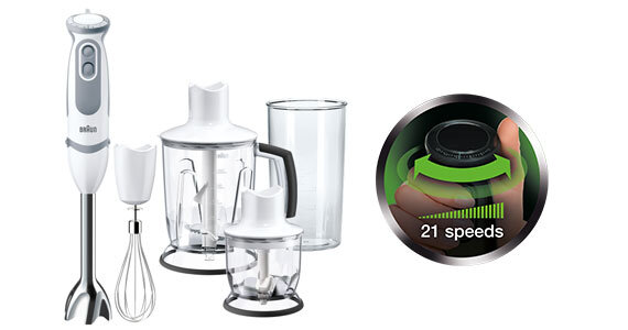 - Máy xay cầm tay Braun MQ 5045 Aperitive Vario 750W 1.25L sử dụng công nghệ điều khiển tốc độ thông minh, nhấn càng mạnh tốc độ xay sẽ càng nhanh. Bạn có thể dễ dàng chuẩn bị bữa ăn chỉ với một tay, thay đổi tốc độ theo ý muốn mà không hề bị gián đoạn. Bánh lăn đa tốc độ với 21 mức tốc độ để bạn chọn lựa sao cho phù hợp nhất với loại thực phẩm cần xay.