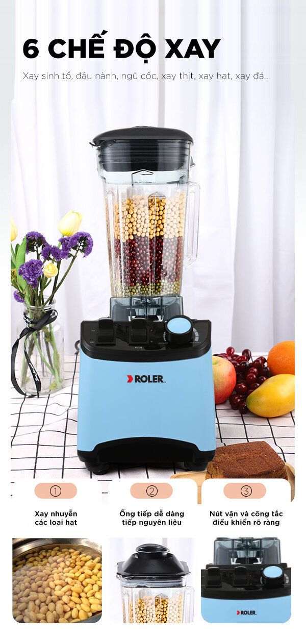 Máy xay sinh tố công nghiệp Roler có 6 chế độ xay được thiết lập sẵn giúp người dùng thuận tiện trong quá trình sử dụng. Máy dùng để: Xay sinh tố, đậu nành, ngũ cốc, xay thịt, xay hạt, xay đá...
