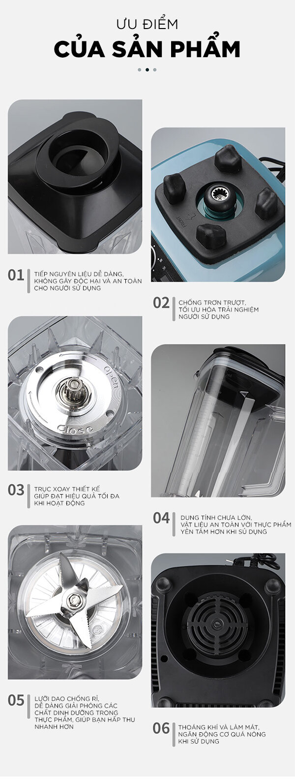 Chân đế chống trơn trượt cho máy vận hành chắc chắn trên cả mặt bàn trơn bóng. Máy xay sinh tố chỉ vận hành khi cối xay lắp đúng khớp trên thân máy.