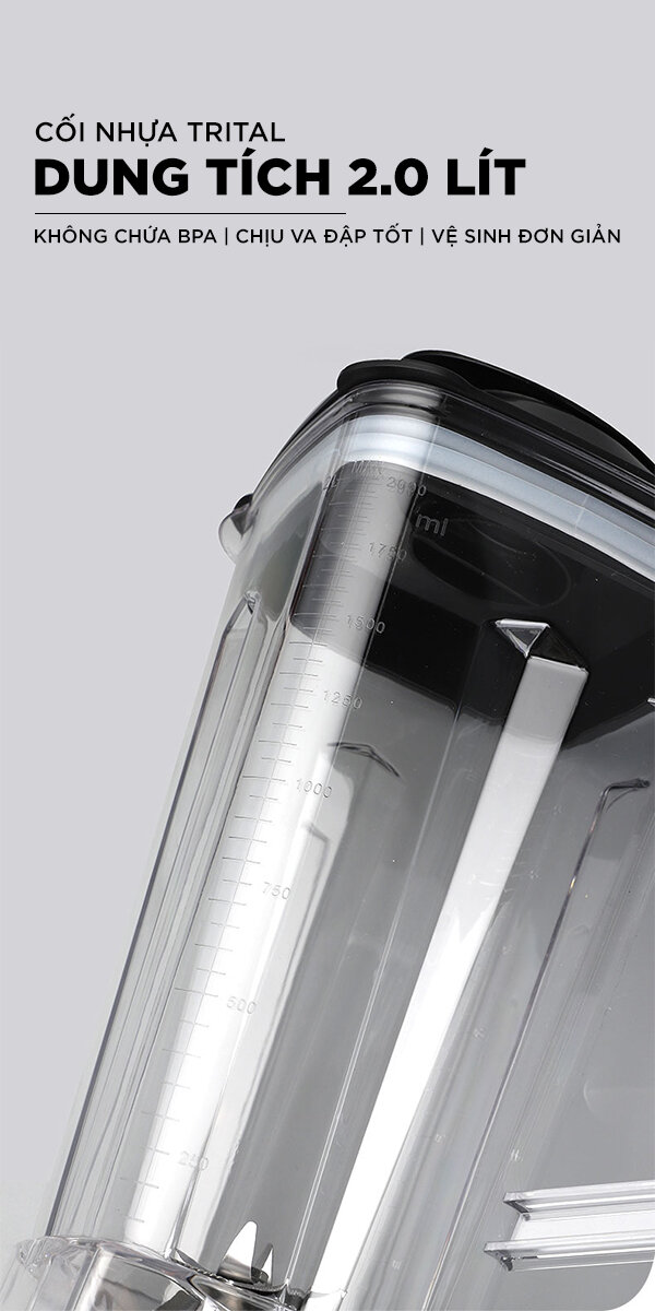 Máy trang bị cối xay sinh tố dung tích 2.0 lít, chịu va đập tốt, cho bạn thoải mái xay được nhiều loại sinh tố cho cả gia đình. Chất liệu cối xay bằng nhựa TRITAL không chứa BPA chịu va đập tốt khi xay đá, an toàn khi tiếp xúc với thực phẩm, vệ sinh đơn giản sau khi dùng.