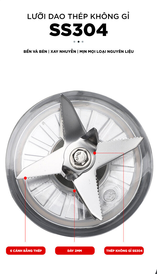 Lưỡi dao inox răng cưa 6 cánh bằng thép không gỉ SS304 dày 2mm có độ bền và bén, xay nhuyễn và mịn mọi loại nguyên liệu: xay sinh tố, xay thịt, xay hạt nhẹ nhàng, nhuyễn mịn.