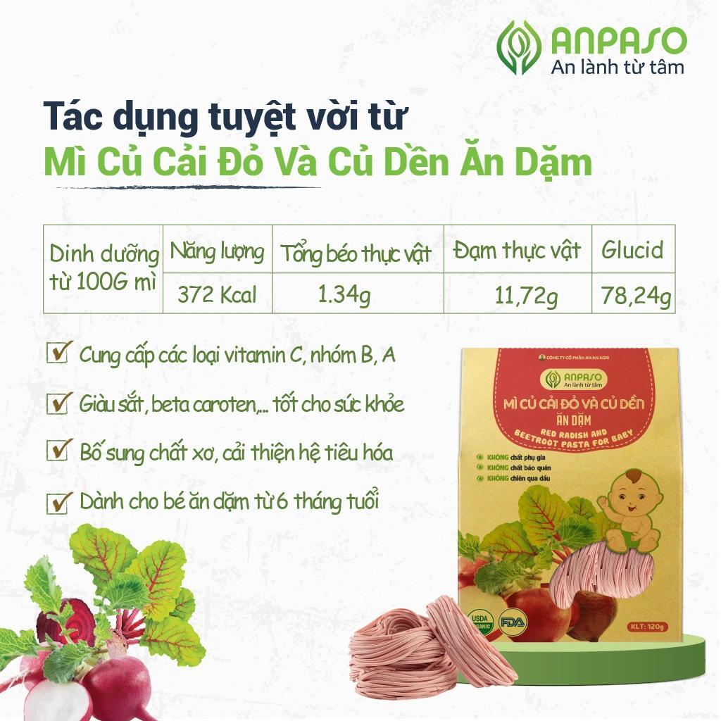 . Sản phẩm Mì rau củ ăn dặm Organic Anpaso đạt chuẩn hữu cơ USDA và được cấp chứng nhận FDA bởi cục quản lý thực phẩm và dược phẩm Hòa Kỳ;. Được sản xuất với quy trình hiện đại và khép kín, chủ động từ khâu chọn giống rau củ, gieo trồng trên vùng nguyên liệu đạt chuẩn hữu cơ , quy trình chăm sóc, thu hoạch và sản xuất được kiểm tra theo dõi chặt chẽ để tạo ra một sản phẩm chất lượng tốt nhất cho người tiêu dùng;. Tỉ lệ rau củ trong mì là 30% - cao nhất trên thị trường hiện nay ! Giúp bổ sung nhiều chất xơ và dưỡng chất khác cho bé cải thiện hệ tiêu hóa và sức đề kháng của bé;. Rau củ được sấy theo công nghệ sấy lạnh hiện đại từ Nhật Bản nên giữ được trọn vẹn dưỡng chất tự nhiên có trong rau củ, sợi mì ngọt dai sẽ kích thích bé ăn nhiều hơn. Một giải pháp cho bé lười ăn rau củ một cách an toàn và hiệu quả;. Sản phẩm hoàn toàn tự nhiên, không chất phụ gia, không chất bảo quản, không chiên qua dầu nên rất tốt cho sức khỏe và sự phát triển của bé.