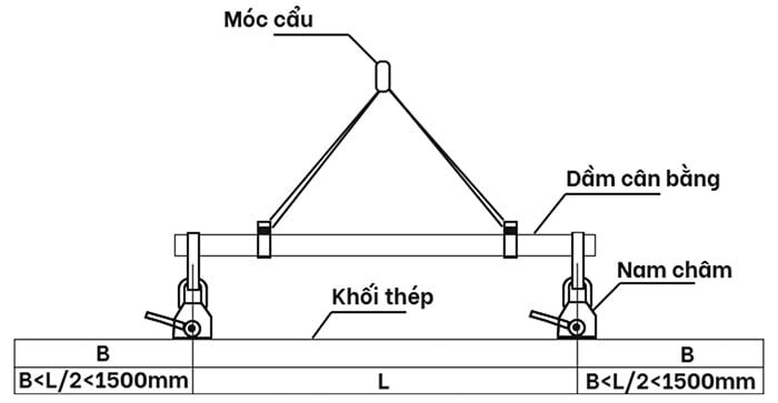 Khi sử dụng nam châm tay gạt để nâng hạ, bạn phải đặt ở chính giữa tấm thép. Nếu tấm thép dài hơn 3000mm phải sử dụng 2 nam châm.