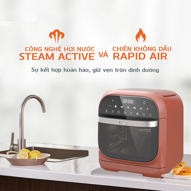 Sự kết hợp hoàn hảo giữa công nghệ chiên không dầu Rapid Air và công nghệ hơi nước Steam Active, hơi nước và nhiệt đối lưu lưu thông 360º giúp thực phẩm chín đều, nhanh mà không bị khô, lại còn hạn chế đến 90% lượng dầu mỡ. Món chiên vàng giòn bên ngoài - ẩm mọng bên trong, giữ trọn hương vị, mang lại cảm giác ngon miệng khó tả. Đây chính là một trong những điểm cộng lớn của nồi chiên hơi nước Unie Steam Mars.