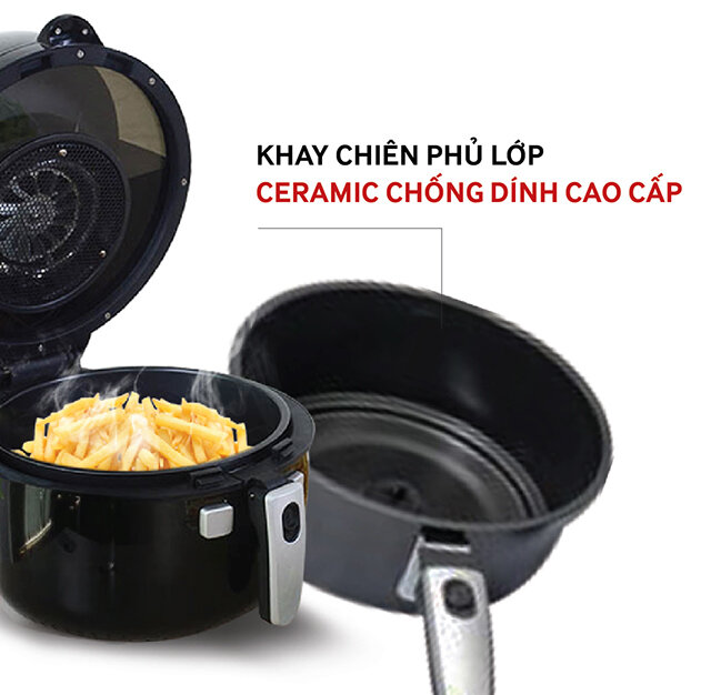 Khay chiên phủ lớp chống dính Ceramic an toàn giúp thực phẩm không bị dính, không bị vỡ nát trong quá trình chiên, rán... dễ chùi rửa sau khi dùng. Mặt kính cường lực trong suốt chịu nhiệt cao, người dùng có thể dễ dàng quan sát quá trình thực phẩm được chiên từ đó điều chỉnh nhiệt độ và thời gian phù hợp.