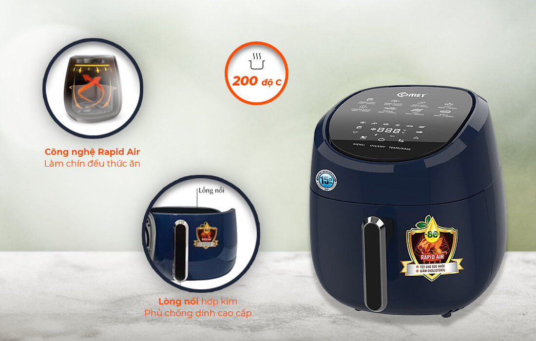 Rapid Air hay Công nghệ tuần hoàn nhiệt 360 độ được ứng dụng nhiều trong các loại nồi chiên không dầu hiện nay mang lại hiệu quả cao. Hoạt động theo cơ chế luân chuyển không khí nóng đi khắp mọi bề mặt thức ăn giúp làm chín nhanh và đều nên món ăn của bạn sẽ luôn vàng giòn bên ngoài và ngon mềm bên trong.