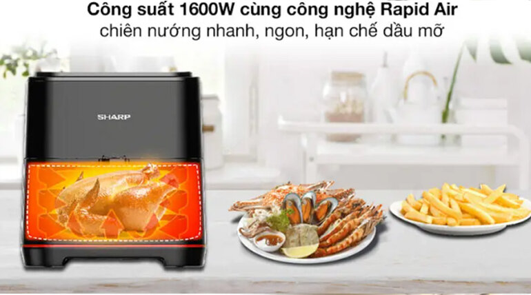 Nồi chiên không dầu điện tử Sharp KF-AF70EV có công suất mạnh 1600W kết hợp với công nghệ chiên Rapid Air tạo dòng đối lưu khí nóng lên đến 200ºC lưu thông xung quanh thực phẩm giúp đồ ăn chín nhanh, chín đều khắp các mặt mà không cần phải thêm dầu mỡ hoặc thêm rất ít, trở nên vàng giòn bên ngoài - ẩm ngọt bên trong. Qua đó tiết kiệm được thời gian và công sức. Hơn nữa, công nghệ còn làm giảm đến 80% lượng mỡ thừa trong thức ăn sau khi chế biến, “cho ra lò” các món ăn lành mạnh, cực kì an toàn cho sức khỏe người dùng, đặc biệt là những gia đình có người già và trẻ nhỏ.