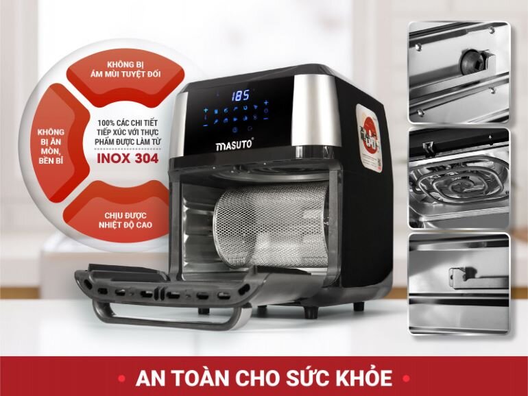 Độ an toàn sức khỏe luôn được đặt lên hàng đầu khi chọn mua nồi chiên không dầu. Hiểu được điều này nên nhà sản xuất Masuto chế tạo bộ phụ kiện gồm 2 khay chiên lưới, khay hứng dầu, lồng chiên, nhông chiên được phủ thêm một lớp chống dính cực kỳ cao cấp, an toàn thực phẩm và thân thiện với sức khỏe cho người dùng. Ngoài ra, các phụ kiện này được thiết kế rời rạc nên việc vệ sinh nồi cũng được đơn giản hoá hơn.