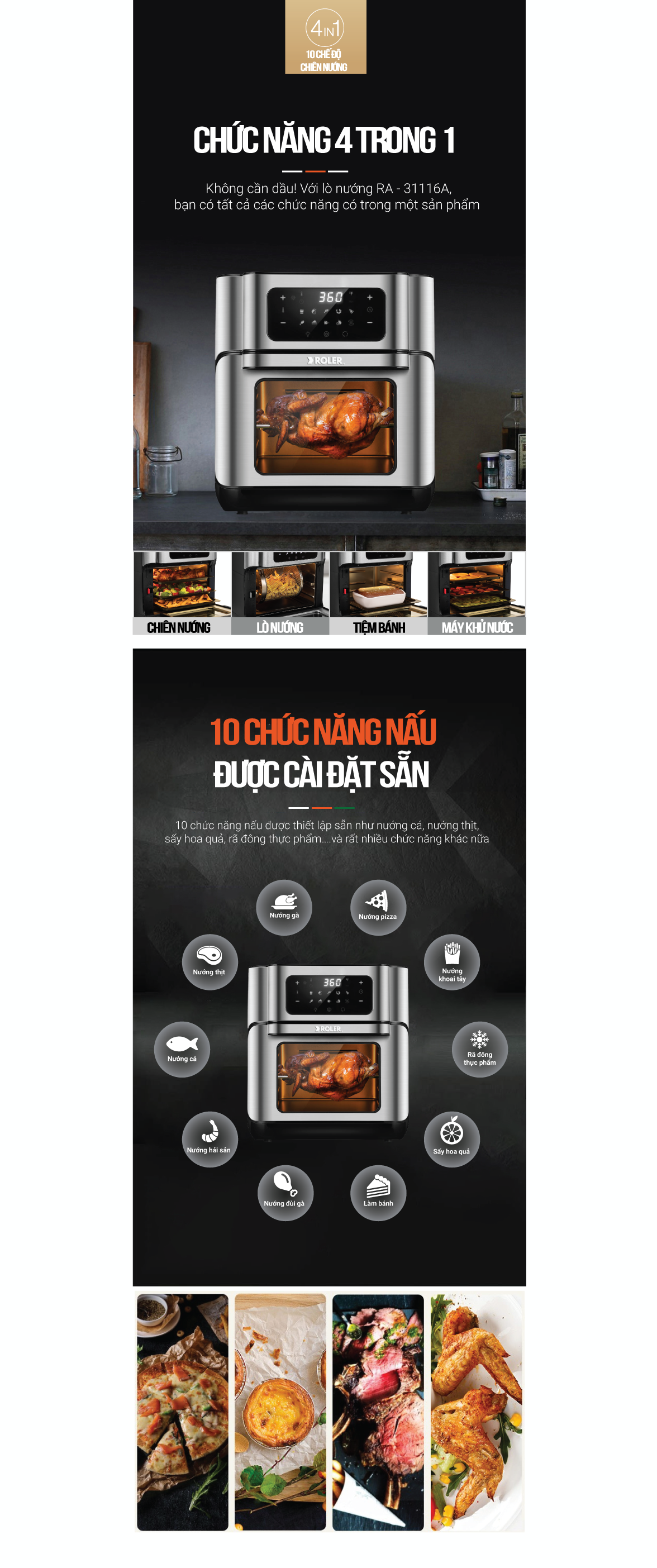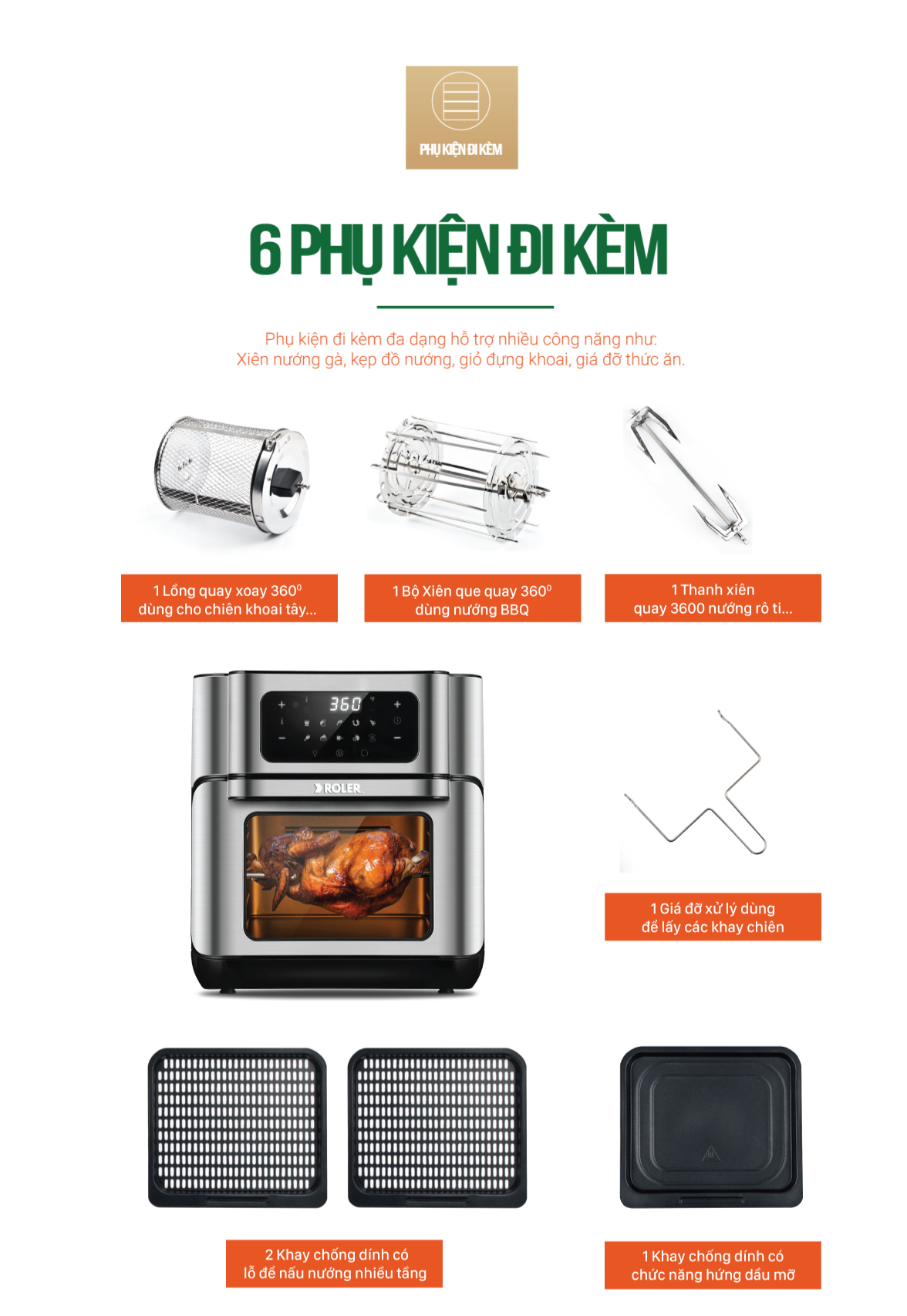 Tiện lợiNồi chiên không dầu cao cấp Roler RA - 3116A được trang bị bảng hiển thị màn hình cảm ứng hiện đại, sang trọng dễ dàng thao tác điều khiển các chức năng chính. Tùy chỉnh thời gian và nhiệt độ nướng, nấu cho các món theo tùy thích. Việc rã đông thực phẩm thuận tiện dễ dàng (120°C, 6 phút). 10 chức năng nấu được thiết lập sẵn như nướng cá, nướng thịt, sấy hoa quả, rã đông thực phẩm….và rất nhiều chức năng khác nữa.Khay nướng dễ tháo rời, dễ vệ sinh. Phụ kiện đi kèm đa dạng hỗ trợ nhiều công năng như: Xiên nướng gà, kẹp đồ nướng, giỏ đựng khoai, giá đỡ thức ăn.