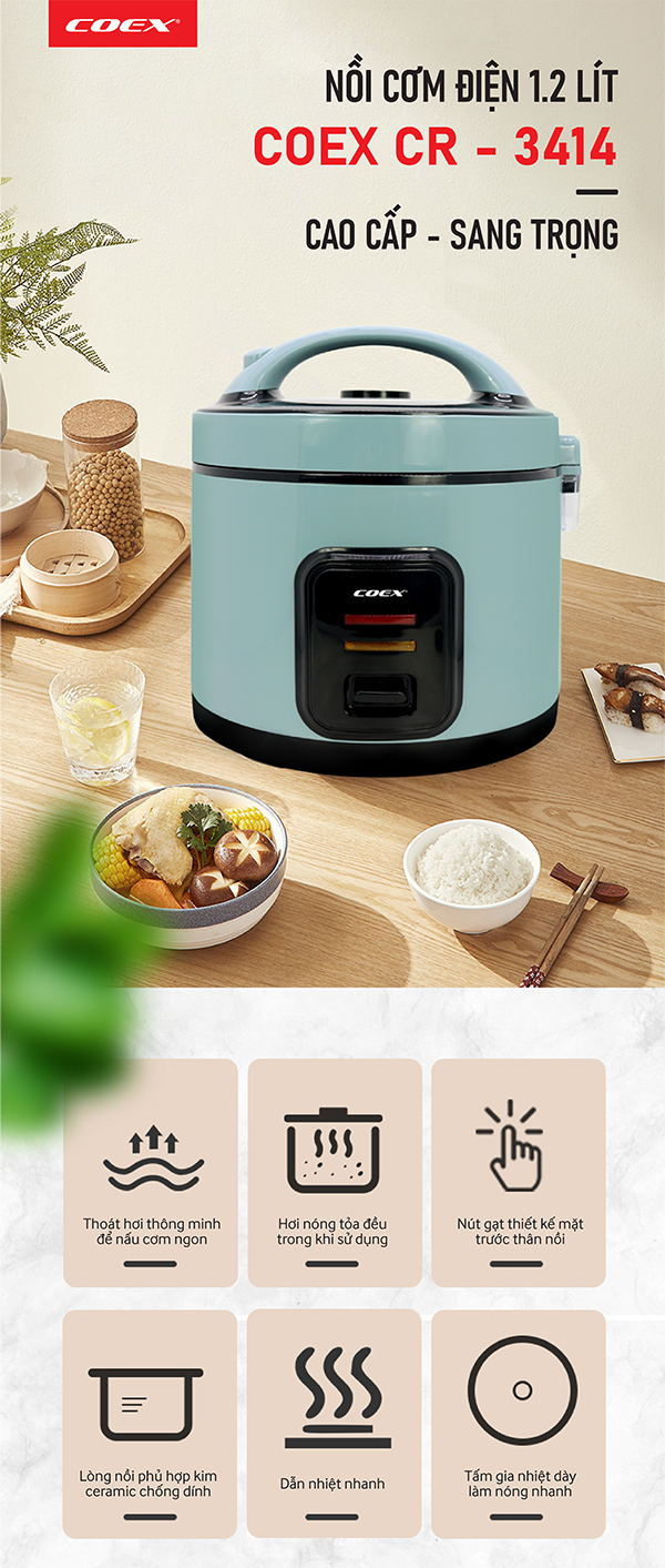 Nấu nhanh hơn, cơm chín đều Với mâm nhiệt lớn kết hợp lòng nồi dạng niêu, công suất 500W và công nghệ 2D tỏa nhiệt từ 2 hướng, nồi cơm điện COEX CR-3414 sẽ cho món cơm chín đều, mềm và ngon hơn. Dung tích 1.2L phù hợp nấu bữa cơm ngon và nhanh cho 2 - 4 người.