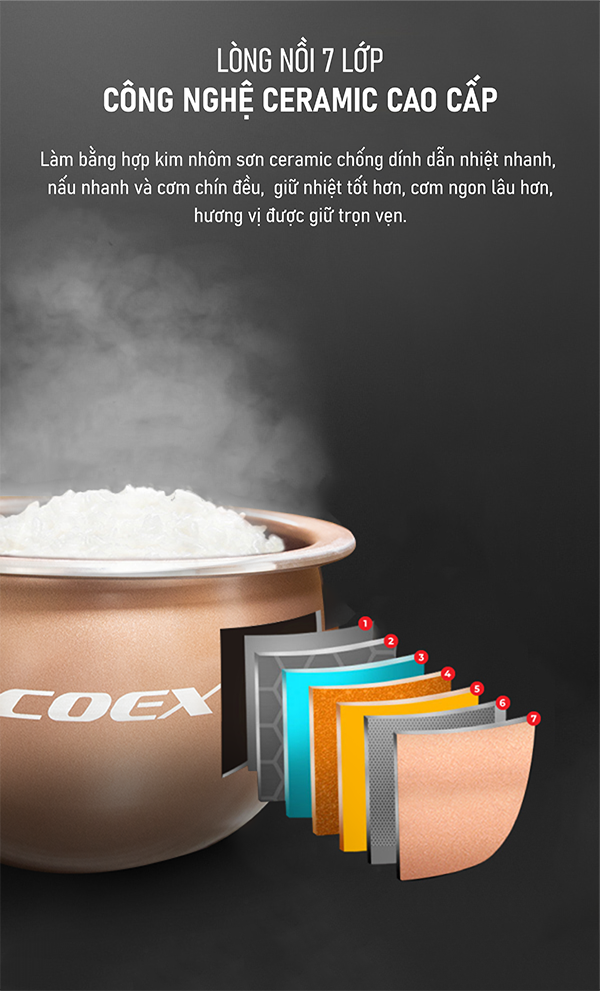 Lòng nồi 7 lớp dày 2.0mm, phủ chống dính Lòng nồi 7 lớp dày 2.0 mm nặng 450 gram bằng hợp kim nhôm sơn ceramic chống dính dẫn nhiệt nhanh,nấu nhanh và cơm chín đều Lòng nồi cơm điện càng dày thì càng giữ nhiệt tốt hơn, cơm ngon lâu hơn, hương vị được giữ trọn vẹn.