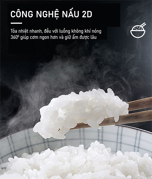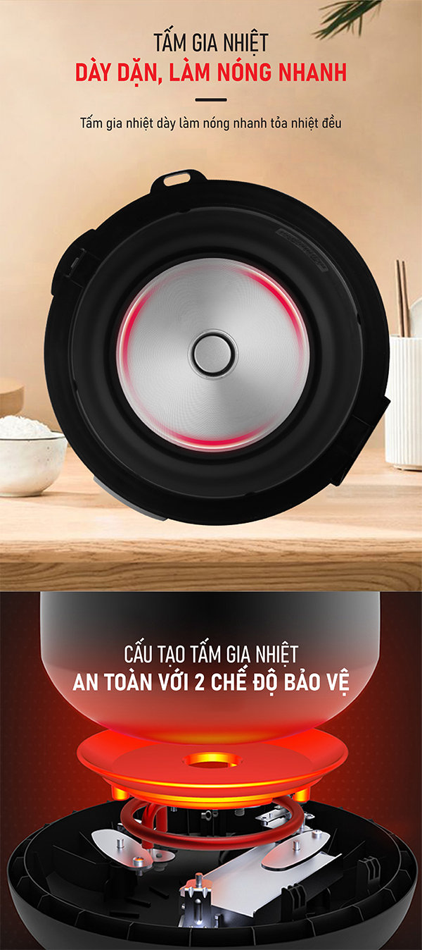 Dễ dàng sử dụng 2 chế độ "Nấu " và "Hâm nóng " điều chỉnh bằng nút gạt đơn giản, có đèn báo hiệu dễ quan sát. Van thoát hơi thông minh hạn chế đọng nước, giữ tối đa vitamin và dưỡng chất. Các bộ phận của nồi như nắp trong, lòng nồi, van thoát hơi, khay đựng nước thừa cũng rất dễ tháo ra để vệ sinh, không gây mùi hôi cho những lần sử dụng sau. An toàn cho sức khỏe, dễ dàng vệ sinh Lớp chống dính Ceramic hoàn toàn không phát sinh các khí độc hại trong quá trình sử dụng, không chứa các độc tố gây hại cho sức khỏe. Ngoài ra, nó ngăn các chất độc hại có thể bị oxy hóa từ kim loại, an toàn tuyệt đối cho sức khỏe gia đình bạn. Lớp chống dính cũng hạn chế tối đa sự bám dính và cháy xém của cơm giúp dễ dàng lau rửa sau khi nấu.