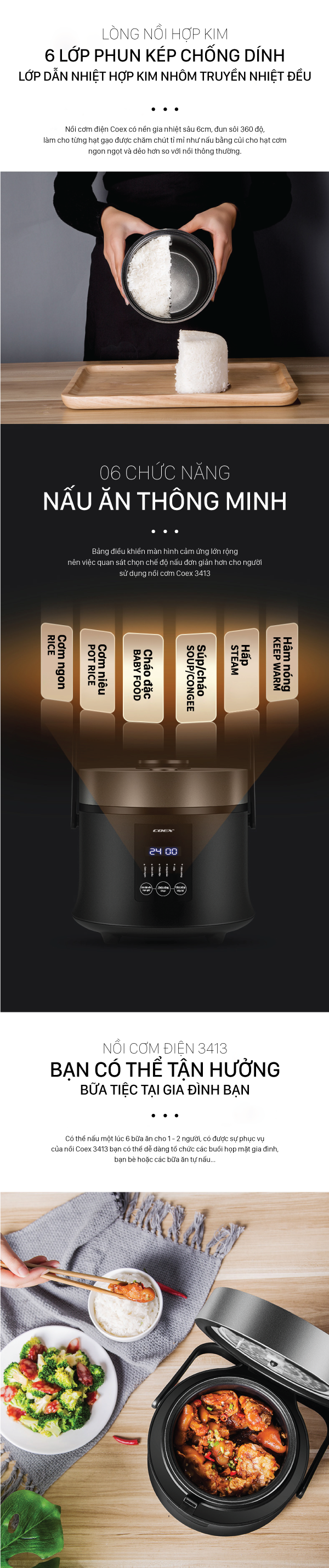 Thiết kế hiện đại, màu sắc trẻ trungNồi cơm điện tử 0.8L Coex CR-3413 thiết kế hiện đại, màu sắc trẻ trung phù hợp mọi căn bếp. Tay cầm tiện lợi, dễ dàng di chuyển. Dung tích nồi cơm điện 0.8L lít đáp ứng đủ nhu cầu nấu cơm cho gia đình từ 1 - 2 người.