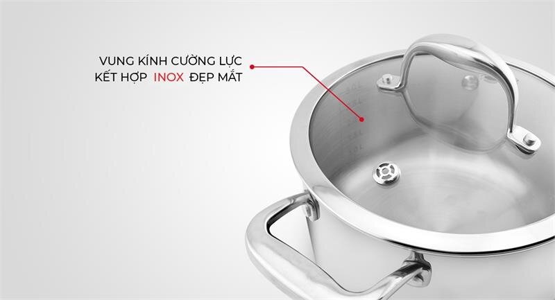 Vung kính cường lực kết hợp inox đẹp mắt: Phần kính cường lực chịu nhiệt, chịu lực dày 4mm giúp bạn dễ dàng quan sát thực phẩm khi nấu trong khi phần viền inox 304 đánh bóng gương giúp tối ưu quá trình vệ sinh, đem đến độ bền bỉ tốt hơn hẳn các loại vung khác. Lỗ thoát hơi lớn giúp chống trào hiệu quả, ngăn bắn nước và hơi nóng khi nấu.