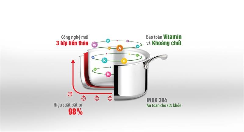 Nồi Trimax XS sử dụng chất liệu lớp trong cùng là inox 304 cao cấp an toàn cho thực phẩm. Inox 304 được khẳng định là hợp kim inox tuyệt vời, có khả năng chống oxi hóa cao. Hợp kim này hoàn toàn không thôi nhiễm các chất độc hại vào thức ăn, có khả năng chống bám bẩn tối ưu và tuyệt đối an toàn cho sức khỏe. Công nghệ mới 3 lớp liền thân “Bí mật” của Trimax XS nằm ở cấu tạo 3 lớp liền thân dày dặn - Sự kết hợp hoàn hảo của 3 lớp kim loại để tối ưu hiệu quả của từng loại chất liệu:
