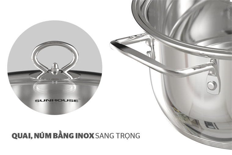 Với quai núm được làm từ inox dang đũa đẹp mắt, nồi inox Sunhouse càng trở nên nổi bật. Đặc biệt, quai núm được thiết kế to bản, tán đinh chắc chắn, cách nhiệt tốt nên bạn rất dễ cầm và di chuyển trong quá trình sử dụng.