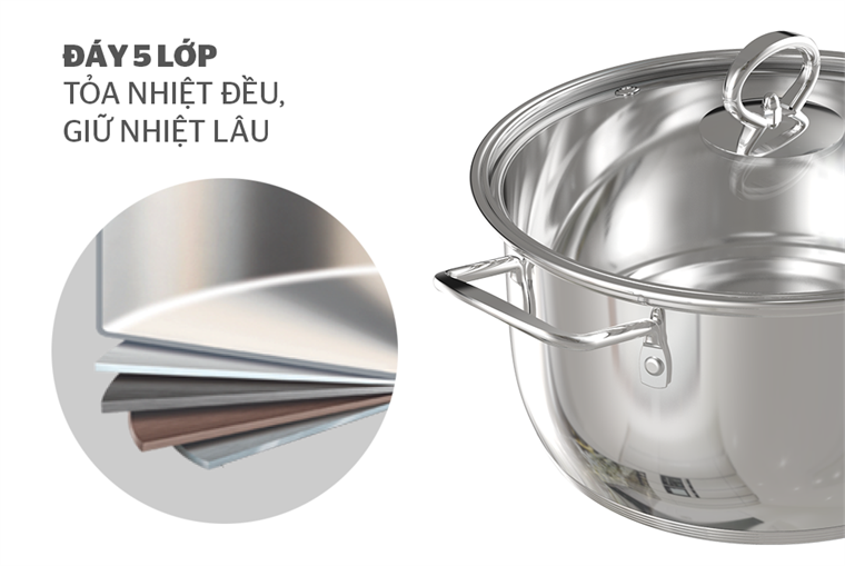 Đáy nồi 5 lớp tỏa nhiệt đều, giữ nhiệt tốt