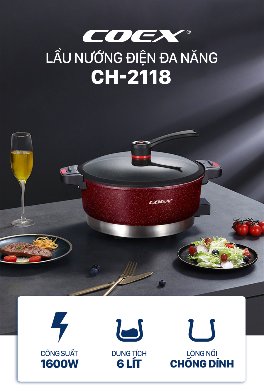 Coex CH-2118 là chiếc nồi lẩu đa năng, nồi có kèm thêm khay hấp nên làm được rất nhiều món: LẨU, HẤP, HẦM, XÀO, RÁN, NẤU CHÁO, LUỘC RAU…
