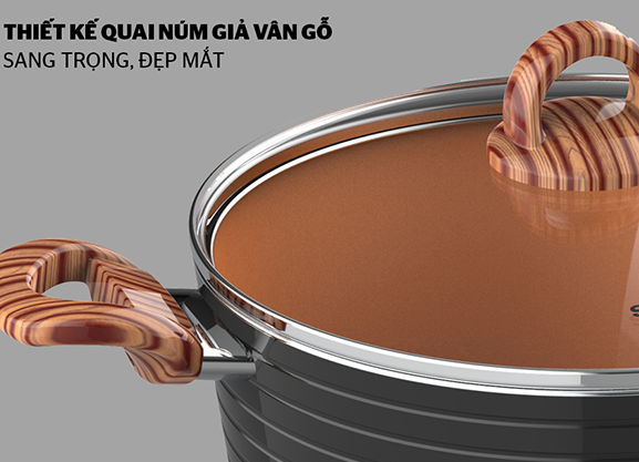 Vung kính viền inox: Vung nồi bằng kính cường lực trong suốt dày dặn, chịu nhiệt tốt với phần núm bằng nhựa bakelit bọc silicon cách nhiệt. Viền inox chắc chắn giúp hạn chế nguy cơ nứt vỡ nếu chẳng may bị rơi.Tay cầm bằng nhựa bọc silicon cách nhiệt: Chất liệu nhựa phủ silicon vân gỗ cách nhiệt, chống bỏng, đảm bảo an toàn trong quá trình đun nấu.