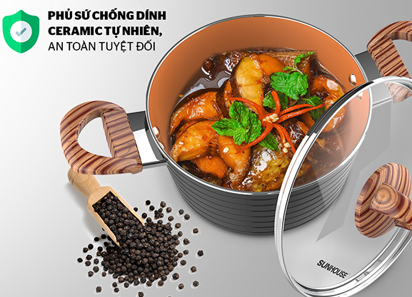 Nồi ceramic đáy từ SUNHOUSE SHG2018MCA với thiết kế tiện dụng cùng chất liệu đặc biệt sẽ mang đến độ bền và tính thẩm mỹ cao cho căn bếp. Được làm từ nhôm đúc nguyên khối có đáy từ, nồi vừa có độ dẫn nhiệt cao, vừa có thể sử dụng trên các loại bếp từ, bếp hồng ngoại hiện đại để tiết kiệm thời gian nấu nướng. Đồng thời, phần nắp nồi bằng kính cao cấp chịu lực chịu nhiệt tốt, tay cầm và núm vung đều được làm từ chất liệu nhựa phủ silicon vân gỗ chịu nhiệt, chống nóng tay khi sử dụng.