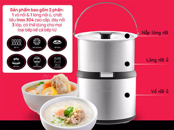 Phần nồi ủ được cấu tạo từ 3 lớp: lớp trong cùng là inox cao cấp 304, tiếp theo là lớp chân không giúp cách nhiệt, lớp ngoài cùng là 1 lớp nhựa cao cấp, hoàn toàn không có BPA.