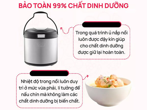 Thức ăn vẫn tiếp tục được nấu chín bên trong nhờ quá trình tích tụ nhiệt. Nhờ đó mà quá trình nấu nướng sẽ tiết kiết kiệm được hơn 70% nguyên liệu nấu so với cách nấu thông thường.