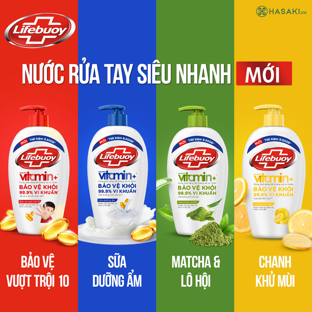 Nước Rửa Tay Lifebuoy Công Thức Vitamin+ Bảo Vệ Khỏi 99,9% Vi Khuẩn là dòng Lifebuoy đến từ của tập đoàn Unilever. Công thức Vitamin+ hoàn toàn mới giúp làm sạch da tay và bảo vệ khỏi 99,9% vi khuẩn, kể cả vi khuẩn biến đổi: Cải tiến hoàn toàn mới với Công thức Vitamin+ bao gồm Vitamin B3, C & E giúp hỗ trợ đề kháng da tự nhiên, được phát triển dành riêng cho tay. Ngoài ra sản phảm chứa 10X dưỡng chất cấp ẩm, mềm mịn cho da tay.