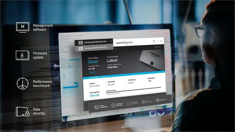 Quản lý ổ đĩa tiên tiến được thực hiện đơn giản. Phần mềm Samsung Magician sẽ giúp bạn theo dõi ổ đĩa của bạn. Một bộ công cụ thân thiện với người dùng giúp cập nhật ổ đĩa của bạn, theo dõi sức khỏe và tốc độ của ổ đĩa, và thậm chí tăng hiệu suất.