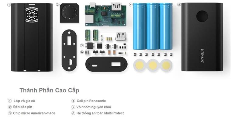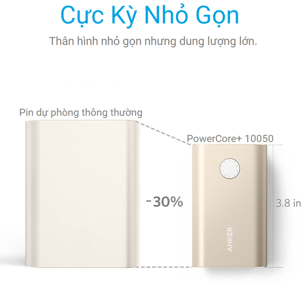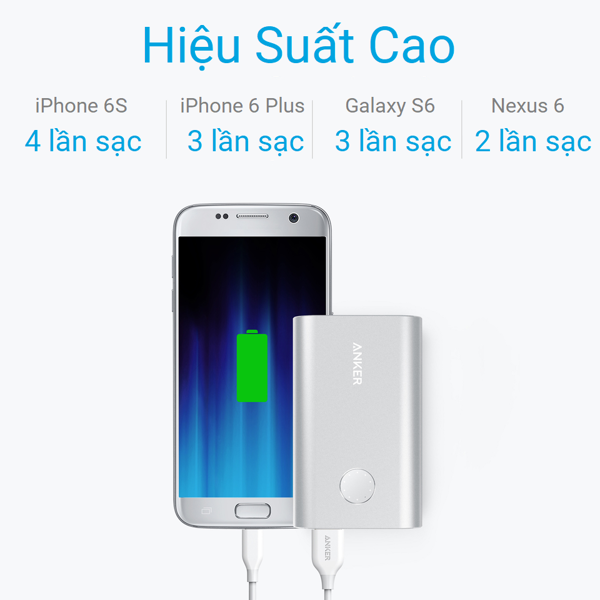 Sạc nhanh cả cổng input Pin dự phòng dung lượng cao thông thường chỉ tích hợp cổng sạc nhanh (ouput) cho điện thoại, còn cổng sạc đầu vào (input) lại không có. Nên khi sạc lại cho cục pin dự phòng thường mất rất nhiều thời gian để sạc đầy. Anker PowerCore+ 10050 tích hợp công nghệ sạc nhanh cho cả cổng input, bạn chỉ mất hơn 3 giờ - nhanh gấp đôi so với pin dự phòng tiêu chuẩn để sạc đầy. Sức mạnh ấn tượng Dung lượng lớn, đủ năng lượng cho nhiều ngày làm việc. Sạc iPhone 6S được 4 lần, iPhone 6 Plus, Galaxy S6 được 3 lần, Nexus 6 được 2 lần.