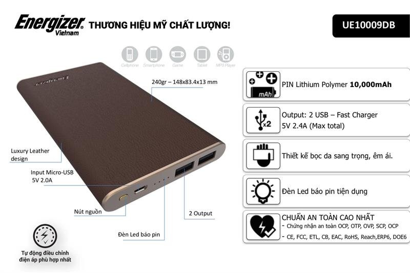 Sạc dự phòng Energizer UE10009 - Bọc da sang trọng & đẳng cấp
