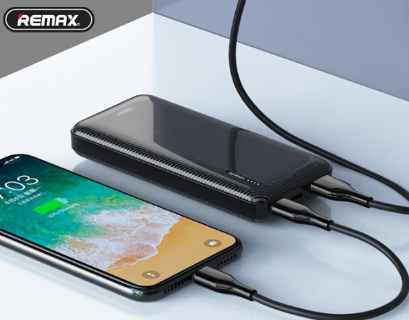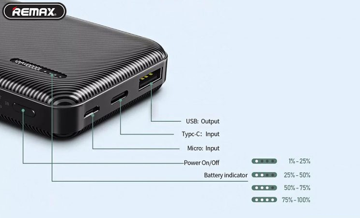 Bề mặt sạc dự phòng remax RPP-153 được thiết kế dạng bóng với các đường vân sóng sánh như mặt nước vô cùng thời trang. Trên thân sạc còn được tích hợp 4 bóng đèn Led giúp hiển thị dung lượng pin vô cùng tiện lợi.