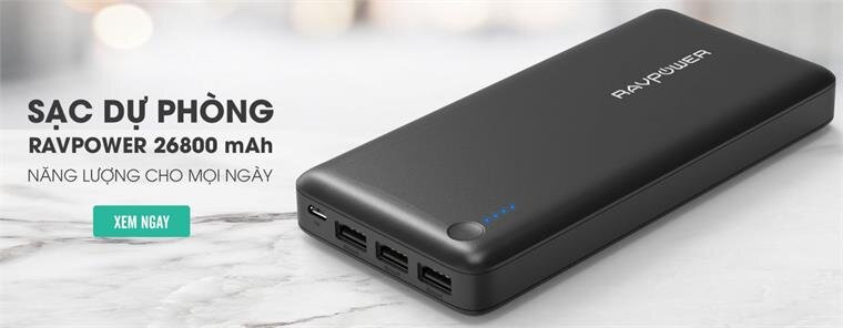 Pin sạc dự phòng cao cấp dung lượng khủng (26800mAh) dùng cho điện thoại, máy tính bảng... Sạc 3 thiết bị cùng lúc: RAVPower PB41 dung lượng 26800mAh được thiết kế với 3 cổng sạc thông minh cho tổng dòng ra lên đến 5.5A, mỗi cổng sạc có thể cấp dòng lên đến tối đa 2.4A dựa trên công nghệ độc quyền iSmart 2.0 (không hỗ trợ sạc nhanh Quick Charge 3.0) Đủ năng lượng cho một tuần làm việc của bạn: Với 1 lần sạc đầy RAVPower PB041 - 26800mAh cho phép sạc đầy iPhone 7 tới 9 lần, Samsung Galaxy S7 khoảng 6 lần, iPad Air hơn 2 lần Sạc nhanh cả 2 cổng input, output: RP-PB041 dung lượng 26800mAh có cổng đầu vào (input) tối đa lên đến 2A, nghĩa là bạn chỉ mất 13 đến 15 giờ - nhanh gấp đôi so với pin dự phòng tiêu chuẩn để sạc đầy. Có nghĩa là bạn chỉ cần tốn thời gian sạc lại trong một đêm nhưng đủ năng lượng cho cả tuần làm việc. Công nghệ an toàn được cải tiến: Điều chỉnh điện áp và dòng điện trong khi đạt được độ chuyển đổi hiện tại an toàn hơn và cao hơn nhờ công nghệ iSmart 2.0 và công nghệ Panasonic Smart IC Hiển thị dung lượng pin trực quan: Nhấn nút nguồn để theo dõi dung lượng pin còn lại với các chỉ thị LED (mỗi đèn LED tương ứng với 25% dung lượng). Khi tất cả đèn LED được thắp sáng, nghĩa là pin dự phòng đã được sạc đầy Sản phẩm chính hãng RAVPower (Mỹ), bảo hành 15 tháng 1 đổi 1 Nếu bạn đang cần một bộ sạc dự phòng dung lượng khủng cho những chuyến đi dài ngày thì Pin sạc dự phòng RAVPower RP-PB41 26800mAh là tất cả những gì bạn cần. Nó có thể cùng lúc sạc 3 thiết bị như điện thoại, máy tính bảng với tốc độ sạc nhanh nhất và nhưng vẫn an toàn nhất.