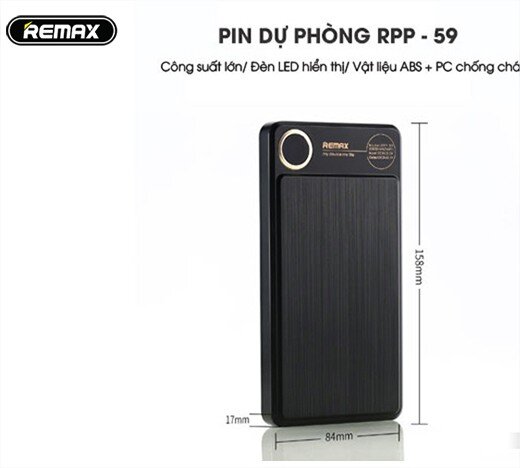 Pin sạc dự phòng Remax RPP – 59 20.000mAh được cấu tạo với hình khối chữ nhật vuông vắn, trọng lượng 366g và kích thước 158*83.7*17.2mm tương đương với một chiếc iPhone 6plus, tuy kích thước hơi to so với sản phẩm thông thường nhưng để so với khối dung lượng khủng là 20.000mAh thì nó cũng không phải là lớn.