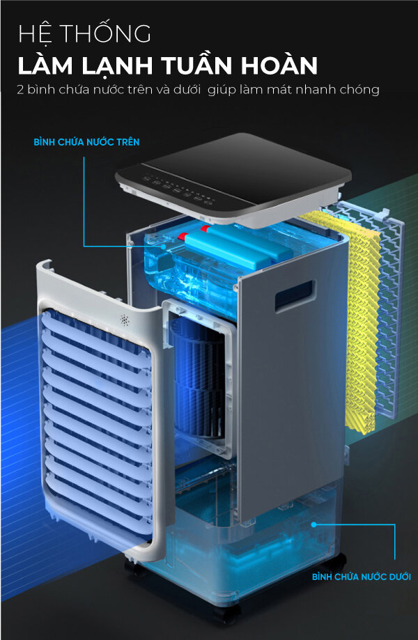 Nguyên lý hoạt động Hoạt động dựa trên nguyên lý bốc hơi nước tự nhiên, Quạt điều hòa là giải pháp làm mát tối ưu. Bạn không cần phải đóng kín cửa như sử dụng máy điều hòa mà không gian trong phòng vẫn luôn được thoáng mát tự nhiên. Bạn cũng không phải lo tình trạng lạnh sốc hay khô da khi bước từ ngoài vào phòng. Luồng không khí cũng được lọc sạch qua 2 lớp: lưới lọc bụi bên ngoài và tấm làm mát phía trong. Tấm làm mát chất liệu gỗ sồi ép, làm mát hiệu quả và bảo vệ môi trường. Cơ chế là lưới lọc bụi sẽ giữ lại các bụi lớn và tấm làm mát khi đang ướt nước sẽ giữ lại các hạt bụi cỡ nhỏ hơn (vì thế nên bạn phải thường xuyên vệ sinh 2 bộ phận này).