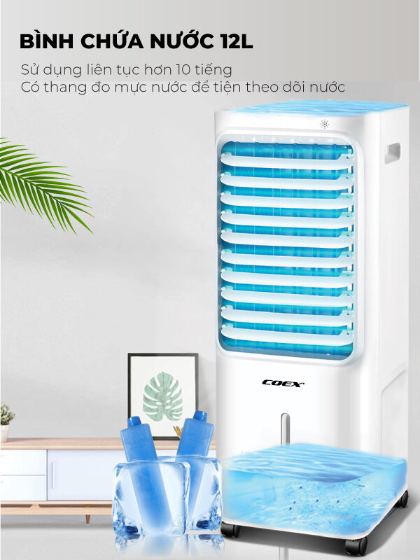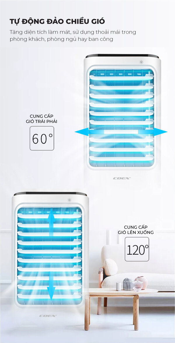 Quạt có chế độ tự động đảo chiều gió trái phải tăng diện tích làm mát, sử dụng thoải mái trong phòng khách, phòng ngủ hay ban công. Khi mua quạt điều hòa Coex, khách hàng được tặng kèm 4 cục đá khô giúp giảm nhiệt độ đáng kể.