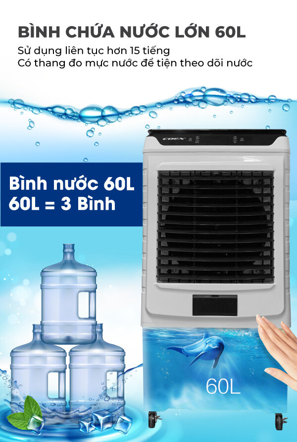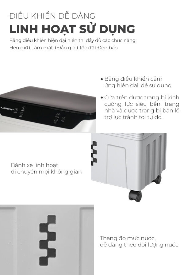 Điều khiển dễ dàng, linh hoạt sử dụngQuạt điều hòa Coex được trang bị bảng điều khiển cảm ứng hiện đại, dễ sử dụng và kèm theo màn hình LED hiển thị đa thông tin tiện lợi. Sản phẩm cũng có kèm điều khiển từ xa đa chức năng, hẹn giờ tắt 0-12 tiếng, dễ dàng thay đổi hoạt động theo ý muốn trong khoảng cách 5m. Quạt điều hòa Coex có 4 bánh xe lớn nên rất dễ di chuyển giữa các không gian khác nhau.