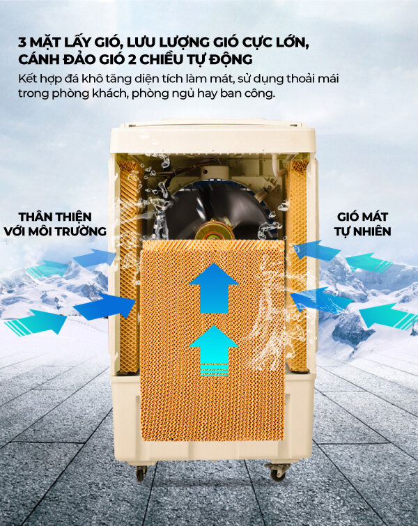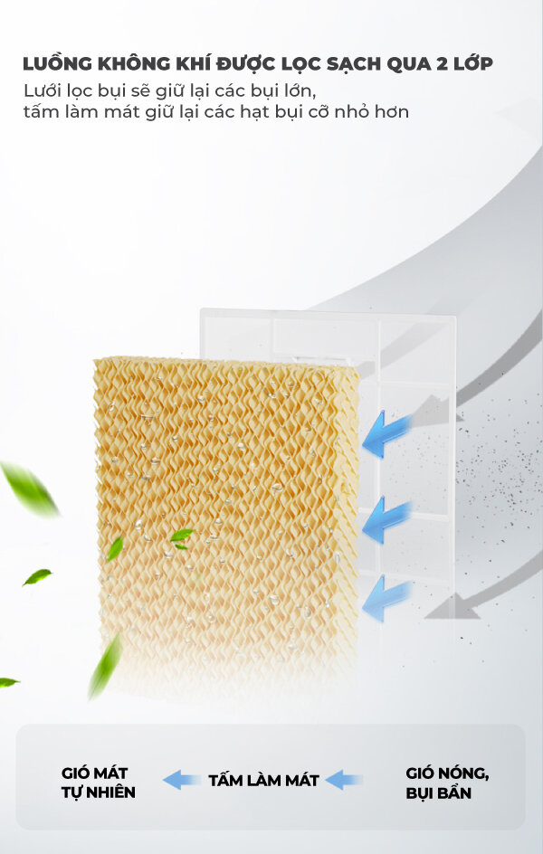 Nguyên lý hoạt động Hoạt động dựa trên nguyên lý bốc hơi nước tự nhiên, Quạt điều hòa là giải pháp làm mát tối ưu cho không gian mở. Bạn không cần phải đóng kín cửa như sử dụng máy điều hòa mà không gian trong phòng vẫn luôn được thoáng mát tự nhiên. Bạn cũng không phải lo tình trạng lạnh sốc hay khô da khi bước từ ngoài vào phòng. Luồng không khí cũng được lọc sạch qua 2 lớp: lưới lọc bụi bên ngoài và tấm làm mát phía trong. Tấm làm mát chất liệu gỗ sồi ép, làm mát hiệu quả và bảo vệ môi trường. Cơ chế là lưới lọc bụi sẽ giữ lại các bụi lớn và tấm làm mát khi đang ướt nước sẽ giữ lại các hạt bụi cỡ nhỏ hơn (vì thế nên bạn phải thường xuyên vệ sinh 2 bộ phận này).